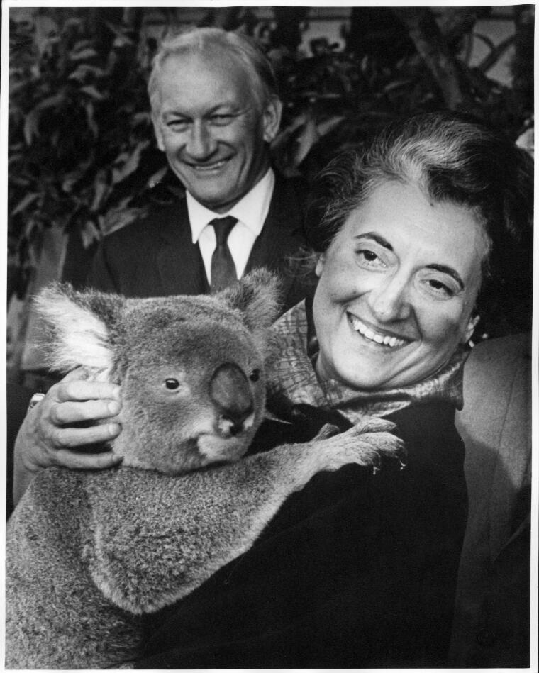 Uh. Now I feel like a dork. I should have stuck with the sex-talk. Here is a picture of Indira Gandhi hugging a koala bear.
